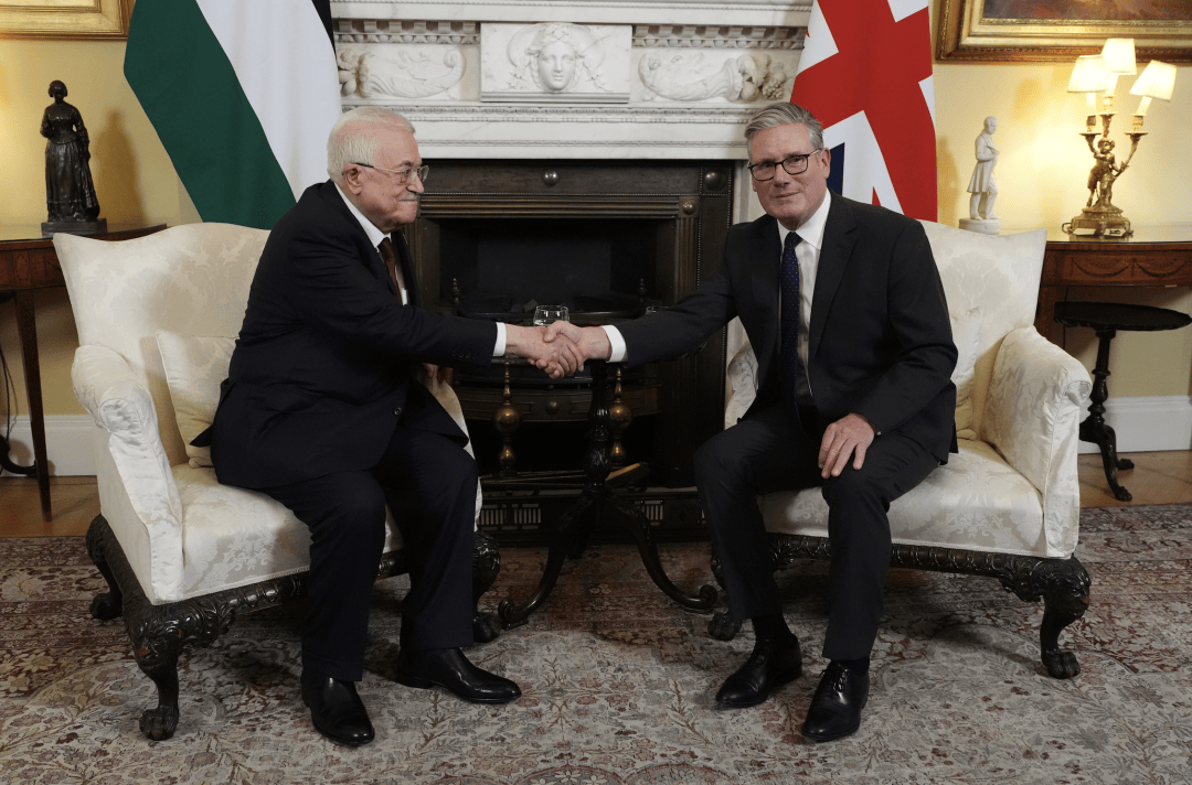 当地时间9月8日,英国伦敦,英国首相基尔·斯塔默(右)在唐宁街会见巴勒斯坦总统马哈茂德·阿巴斯。图源:视觉中国