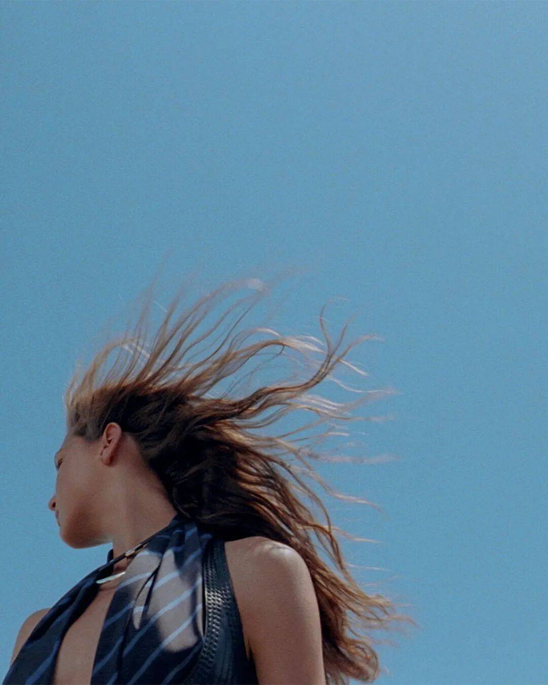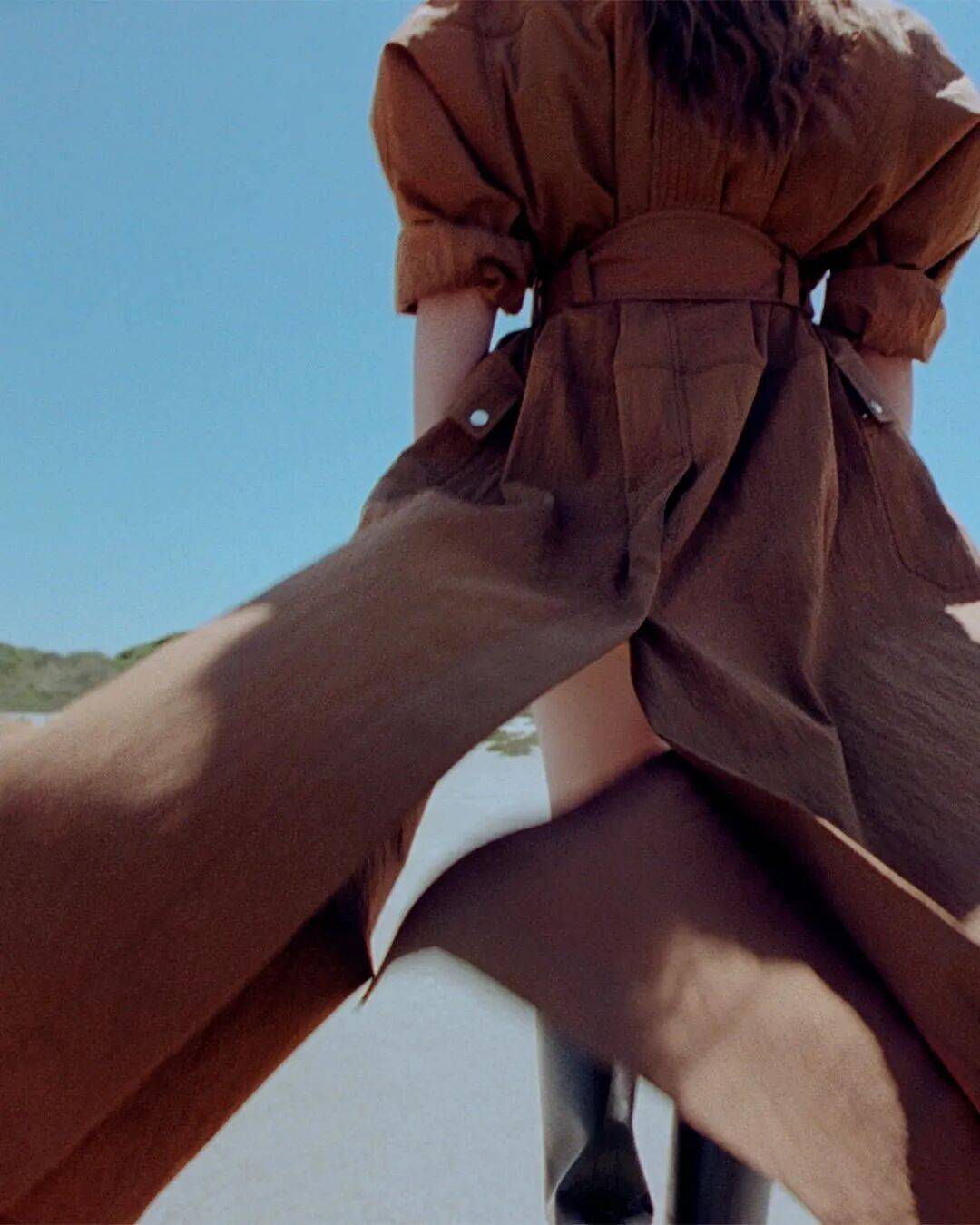 短片中,日晒夏日,海水咸湿,她的褐色长发与棕色长款风衣随风飘扬,脚踩一双黑色长筒马靴,沿海滩漫步。自在随性,松弛而又不失性感的迷人魅力。这也几乎奠定了女装艺术总监Nadège Vanhée在本季系列中为Hermès塑造的自由女骑士形象。