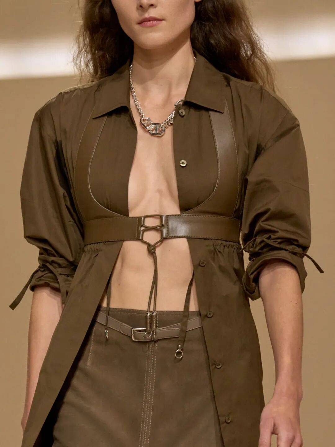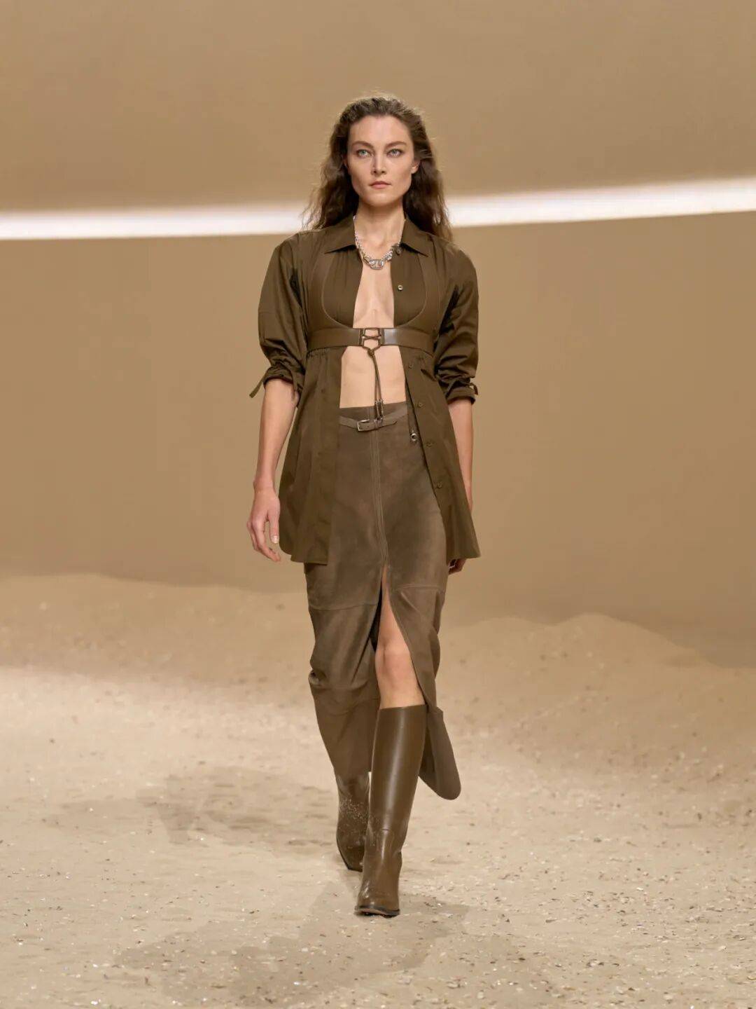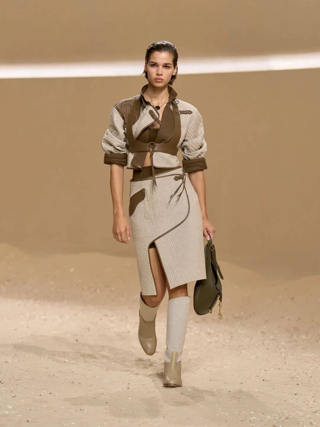 本季设计灵感,同样也与卡马格地区密不可分。Vanhée提到,Hermès档案馆中珍藏的一副来自卡马格地区的古老马鞍吸引了她的注意,“我想赋予它一种自由、随性和波西米亚风情的精神,并将马术风格融入到这座城市中。”于是,她将其转译重制,最典型的则是系列中出现在大多数造型上的皮革紧身胸衣。