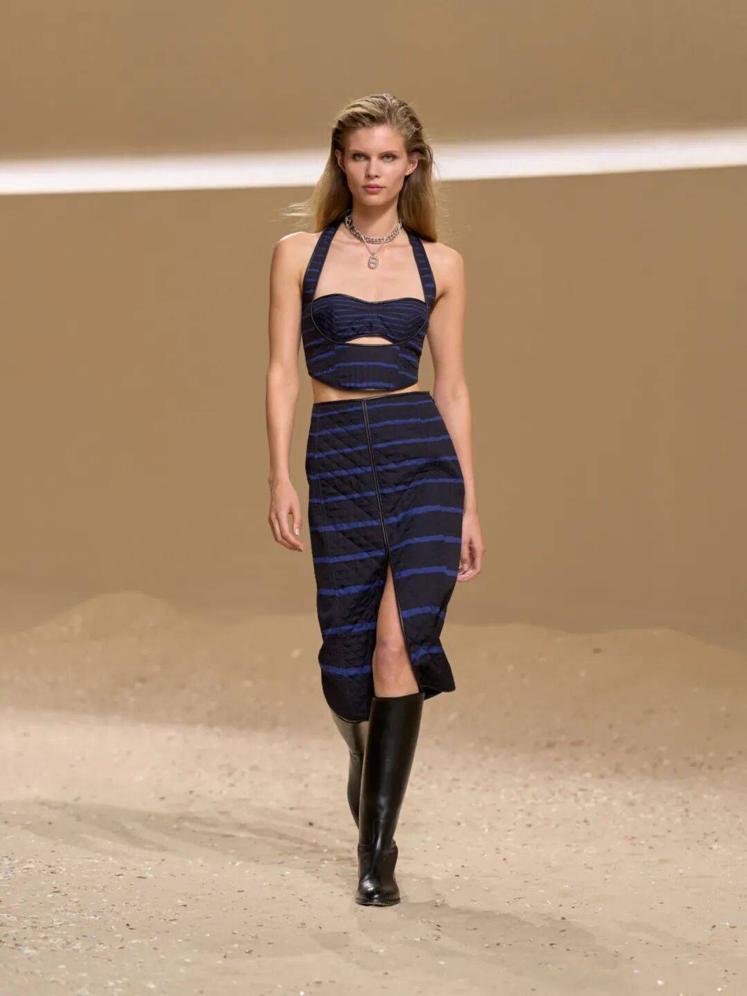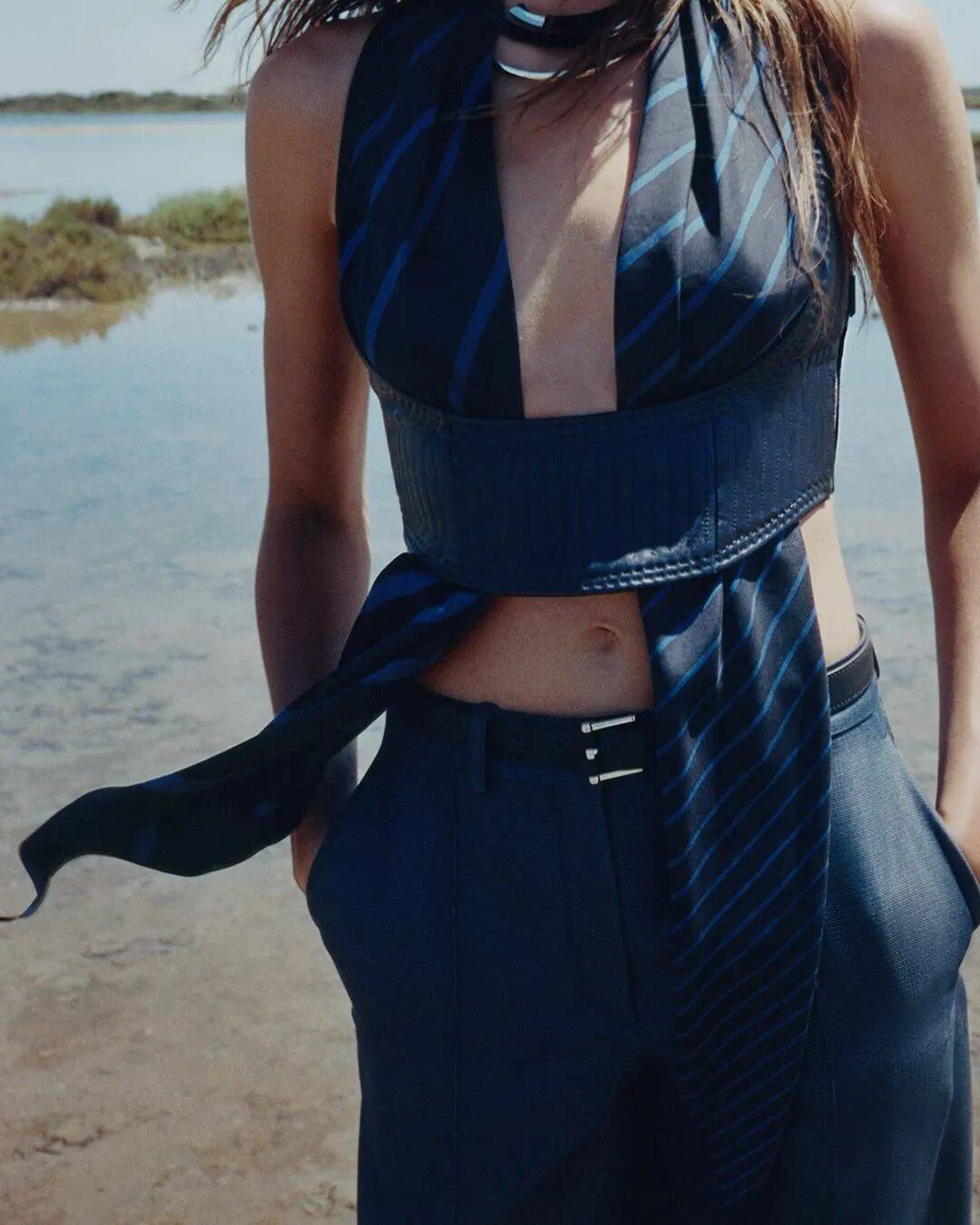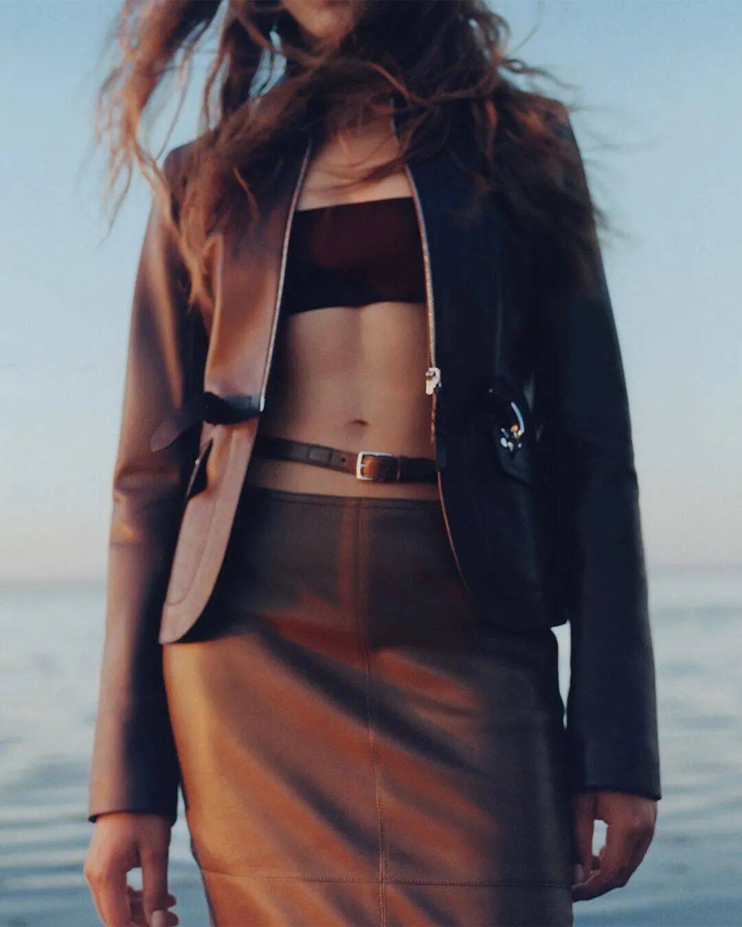 本季设计灵感,同样也与卡马格地区密不可分。Vanhée提到,Hermès档案馆中珍藏的一副来自卡马格地区的古老马鞍吸引了她的注意,“我想赋予它一种自由、随性和波西米亚风情的精神,并将马术风格融入到这座城市中。”于是,她将其转译重制,最典型的则是系列中出现在大多数造型上的皮革紧身胸衣。
