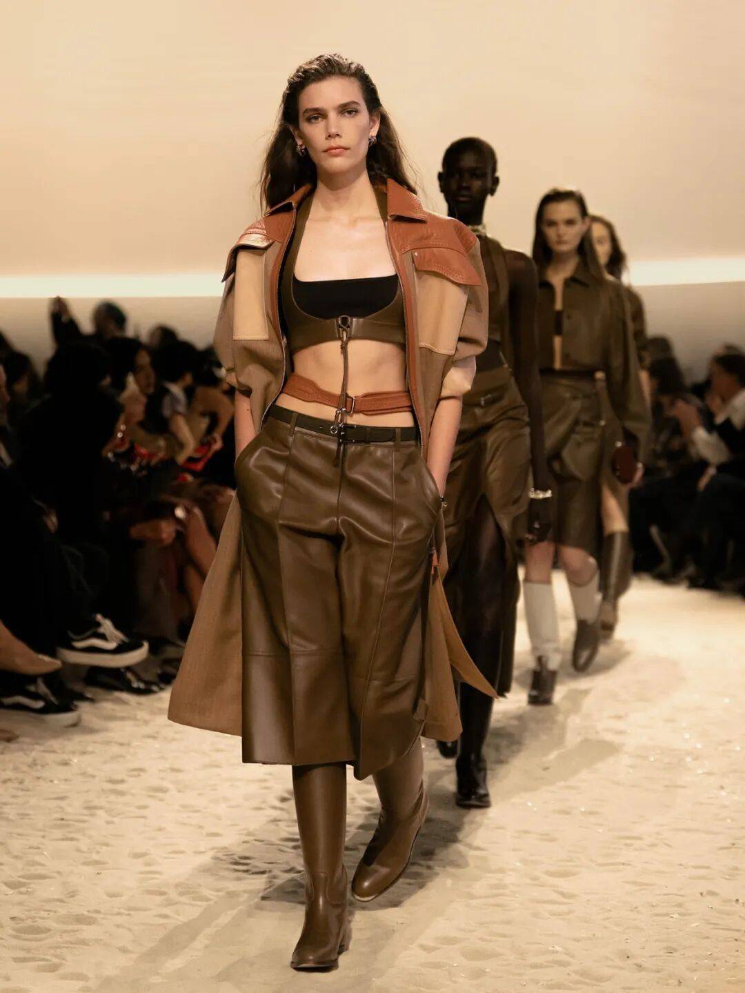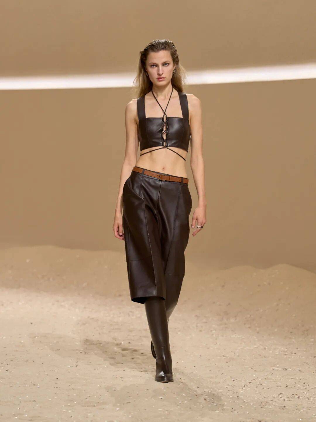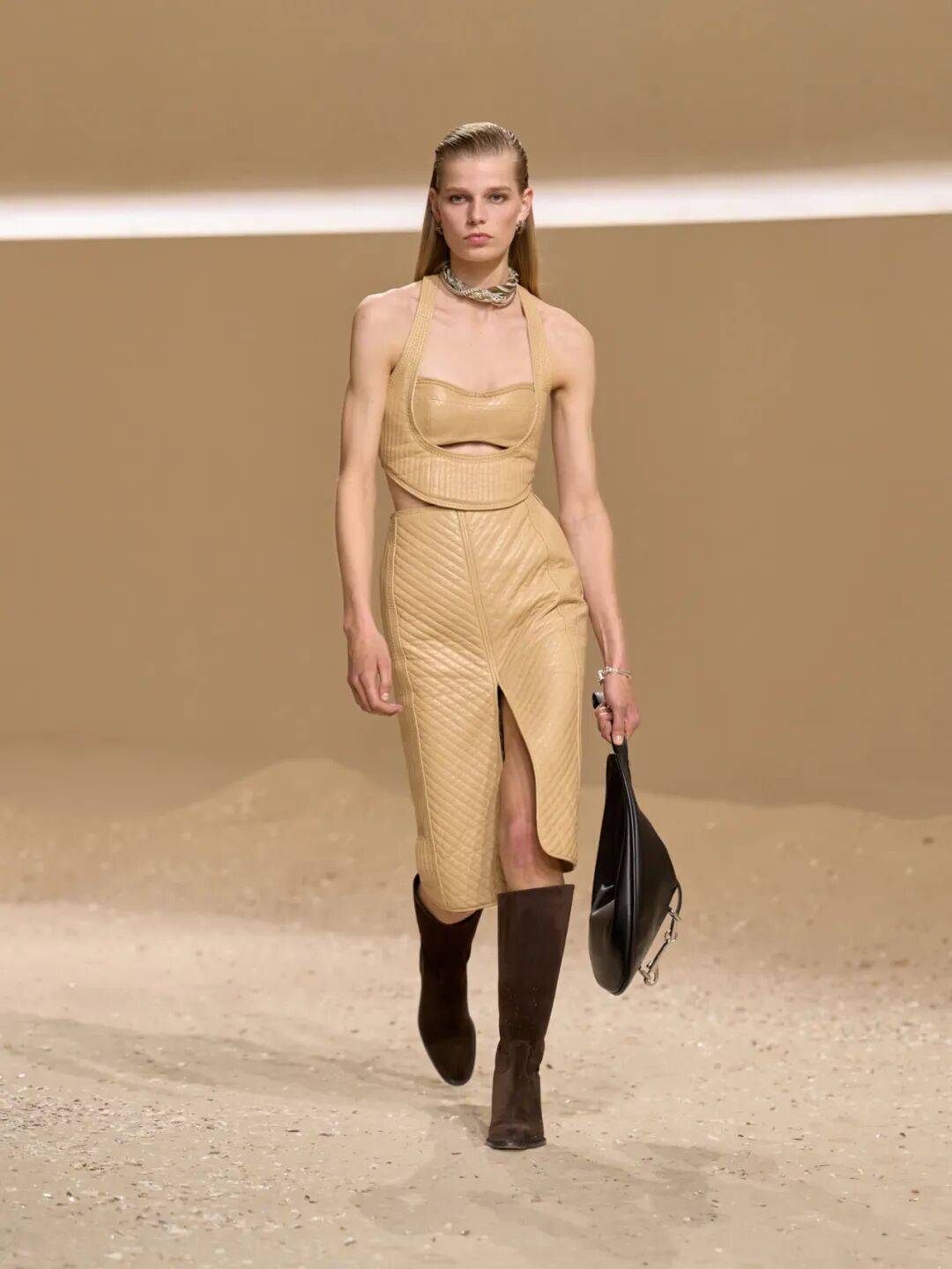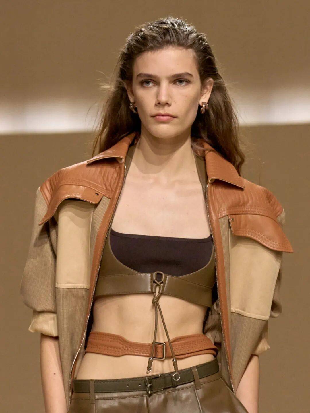 不仅如此,皮革胸衣也为整体造型增添了一份力量感,精准的剪裁像是围绕女性身体曲线绘制而成,与那些皮质拼接短裙、半身裙和长裤一同为当代女性构筑了一层软盔甲,彰显了Hermès精湛的皮革工艺,又致意女性的勇敢无畏和不羁气质。