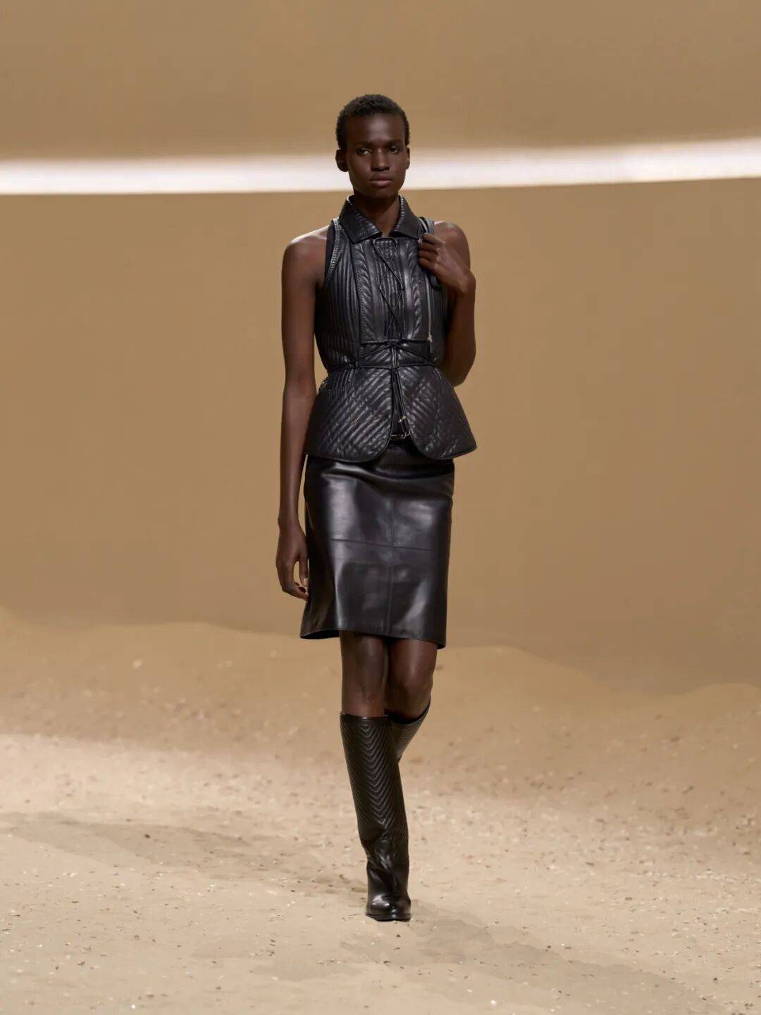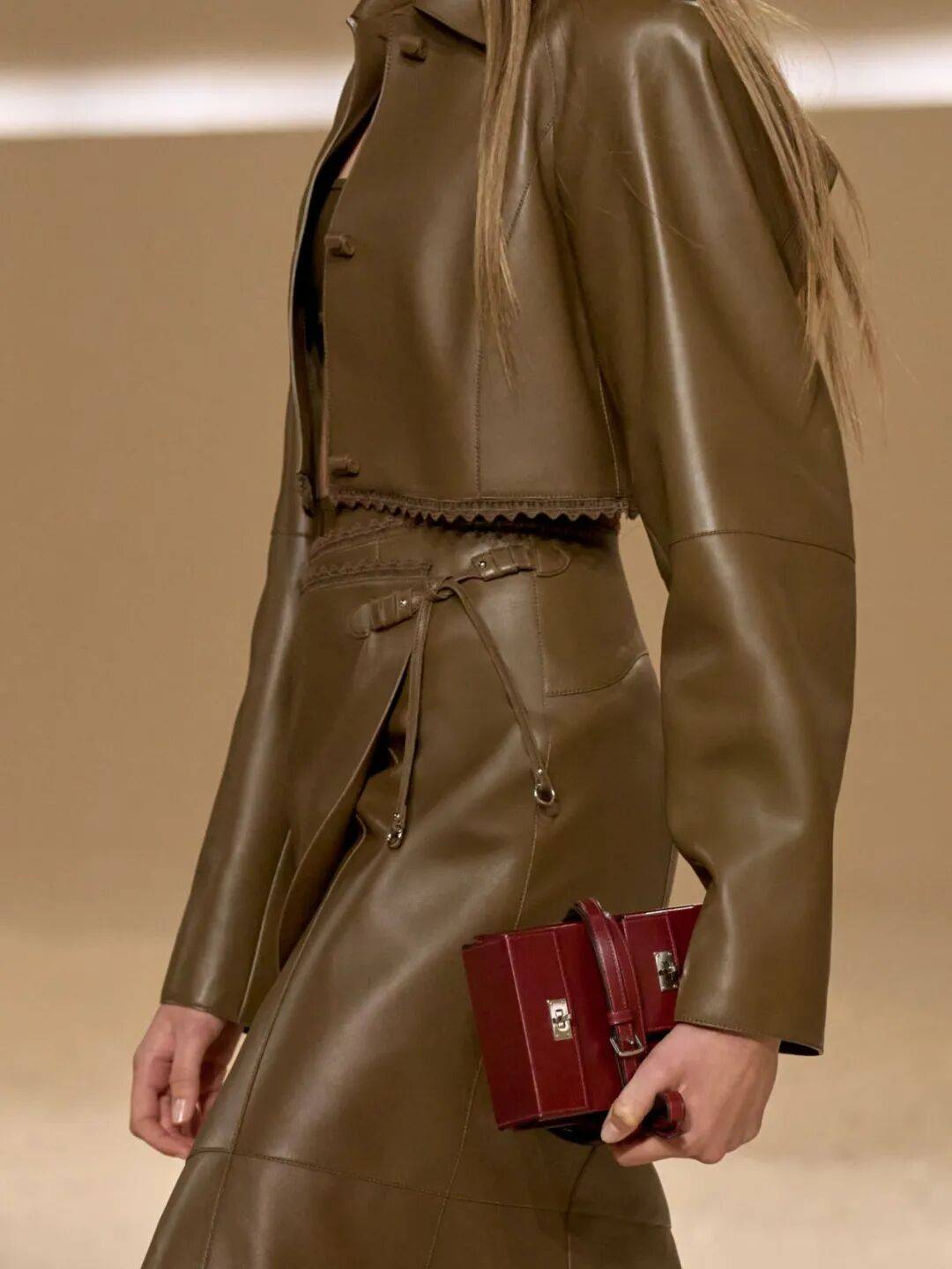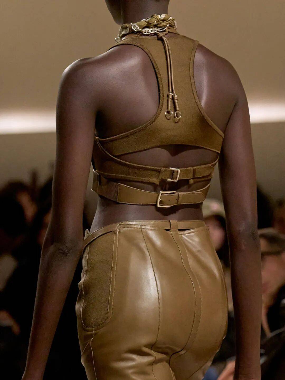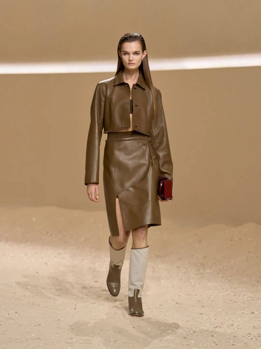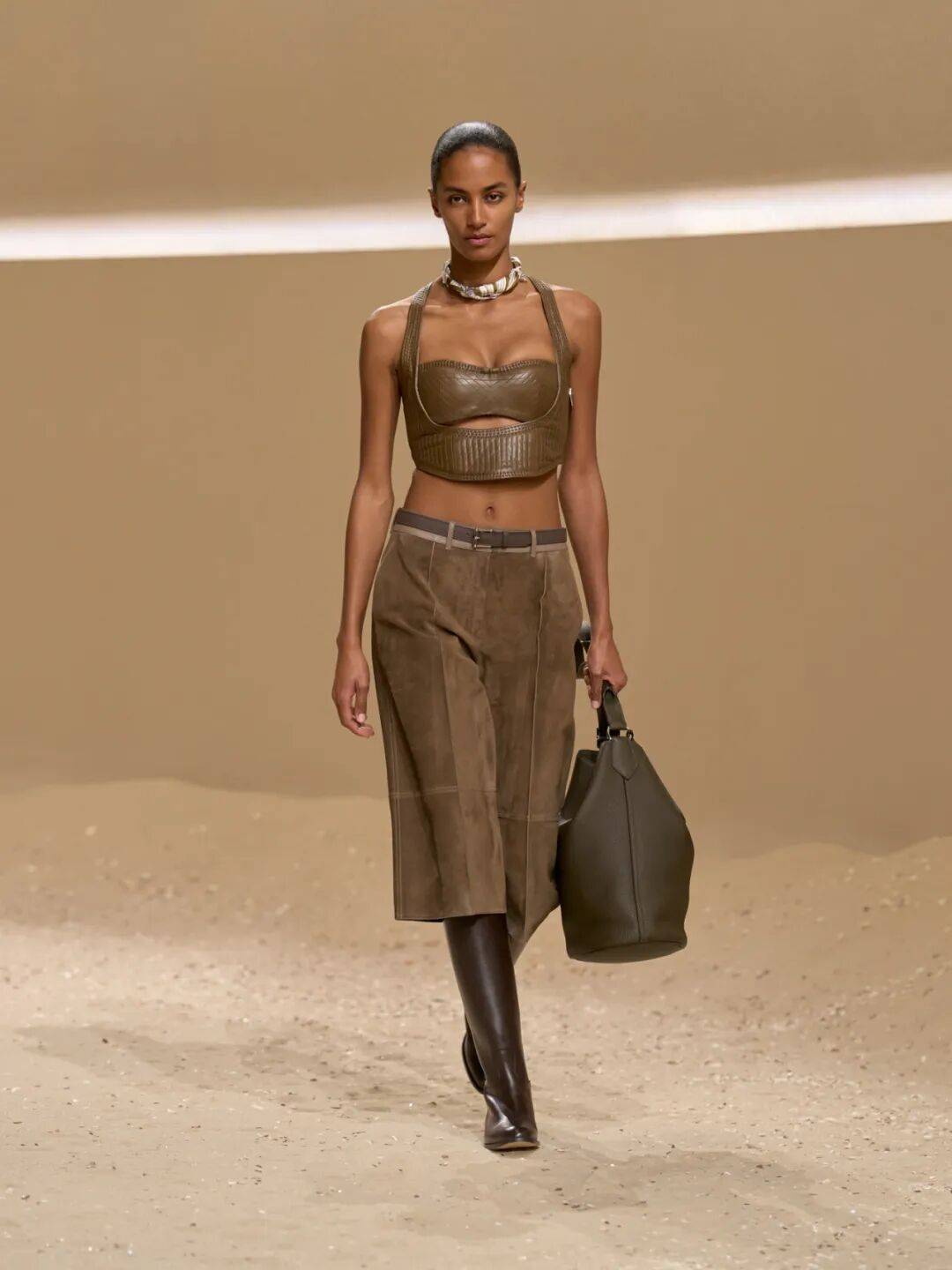 不仅如此,皮革胸衣也为整体造型增添了一份力量感,精准的剪裁像是围绕女性身体曲线绘制而成,与那些皮质拼接短裙、半身裙和长裤一同为当代女性构筑了一层软盔甲,彰显了Hermès精湛的皮革工艺,又致意女性的勇敢无畏和不羁气质。