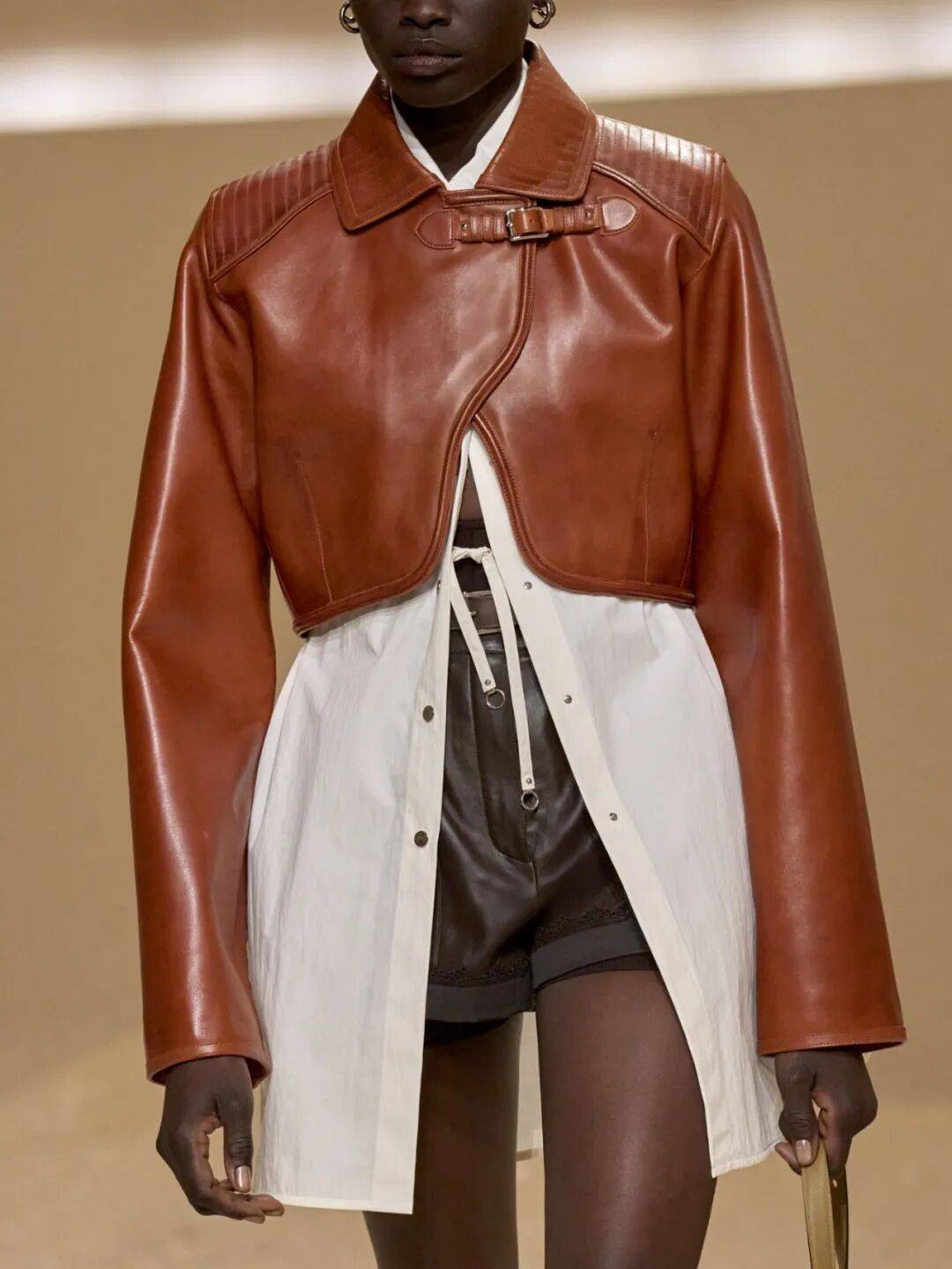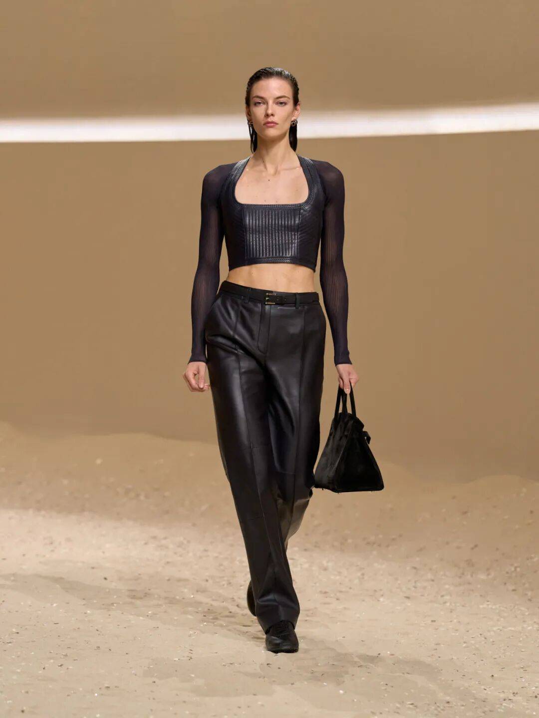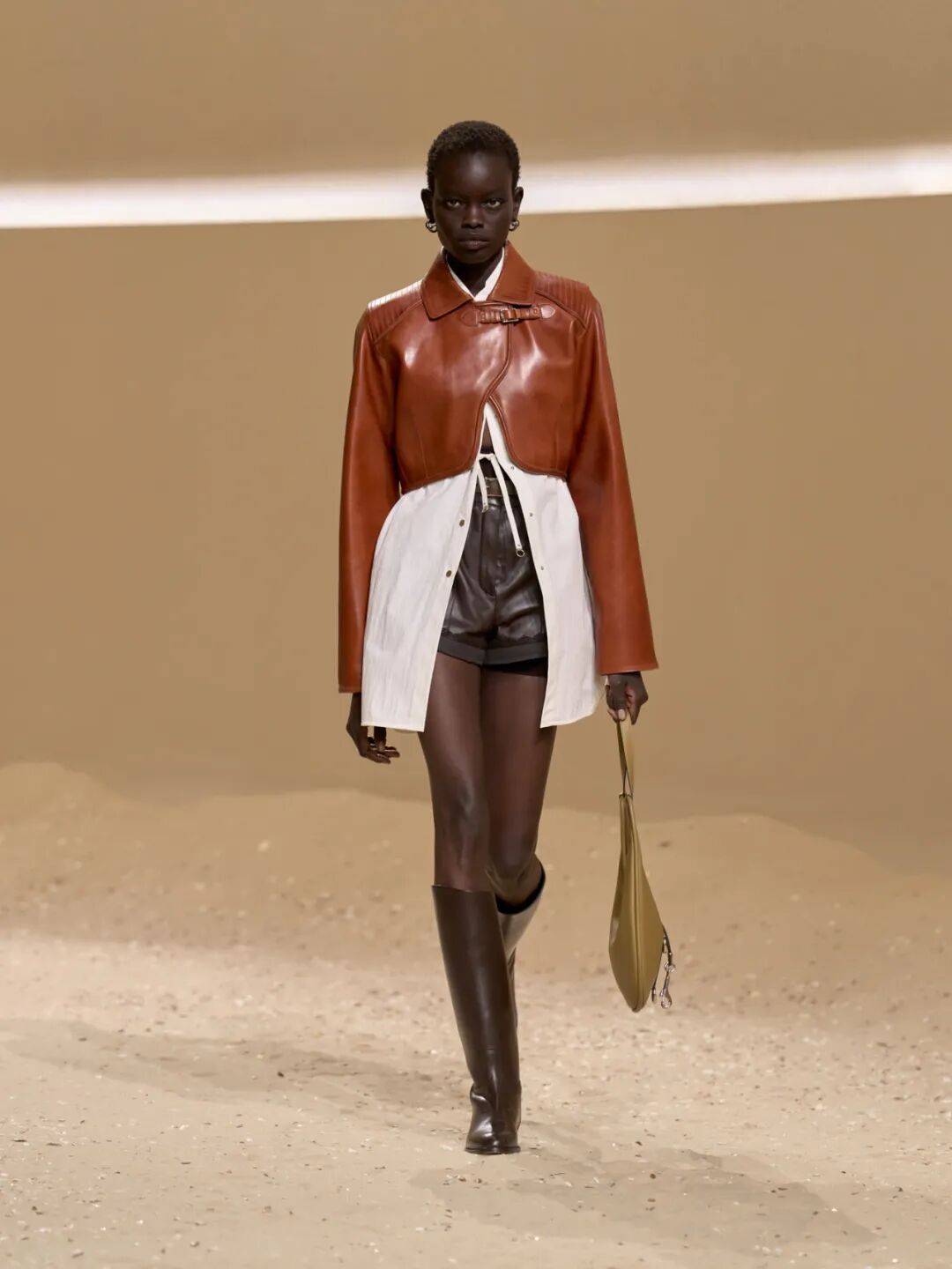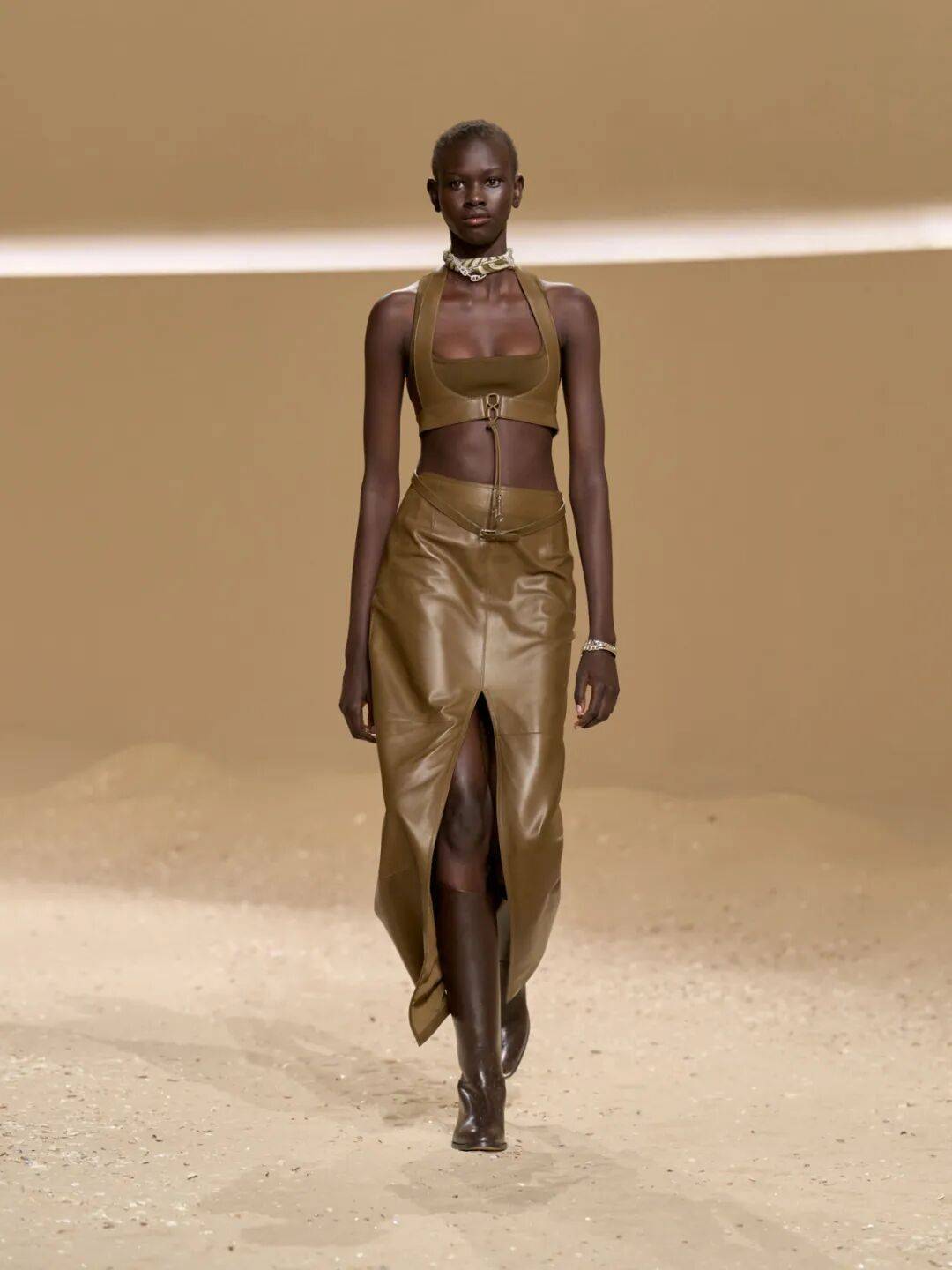 不仅如此,皮革胸衣也为整体造型增添了一份力量感,精准的剪裁像是围绕女性身体曲线绘制而成,与那些皮质拼接短裙、半身裙和长裤一同为当代女性构筑了一层软盔甲,彰显了Hermès精湛的皮革工艺,又致意女性的勇敢无畏和不羁气质。
