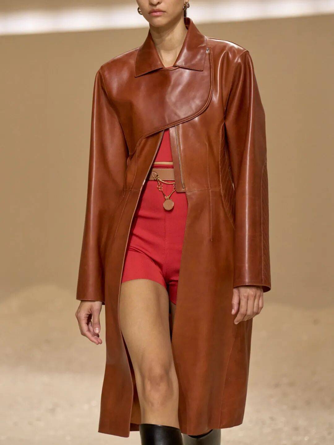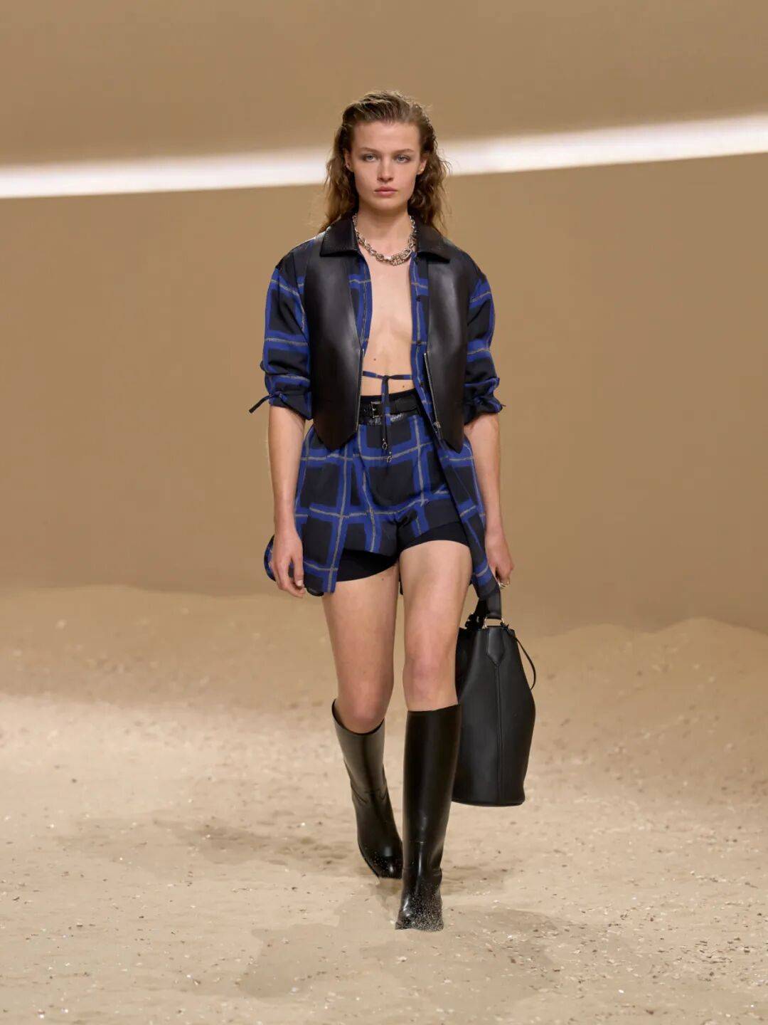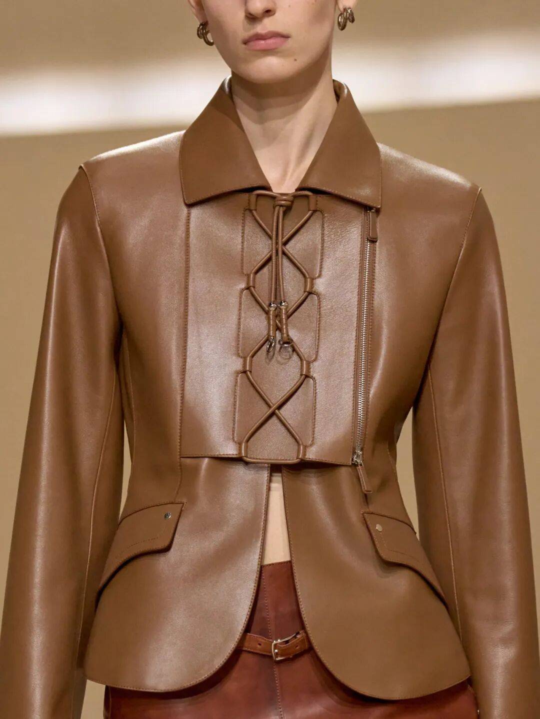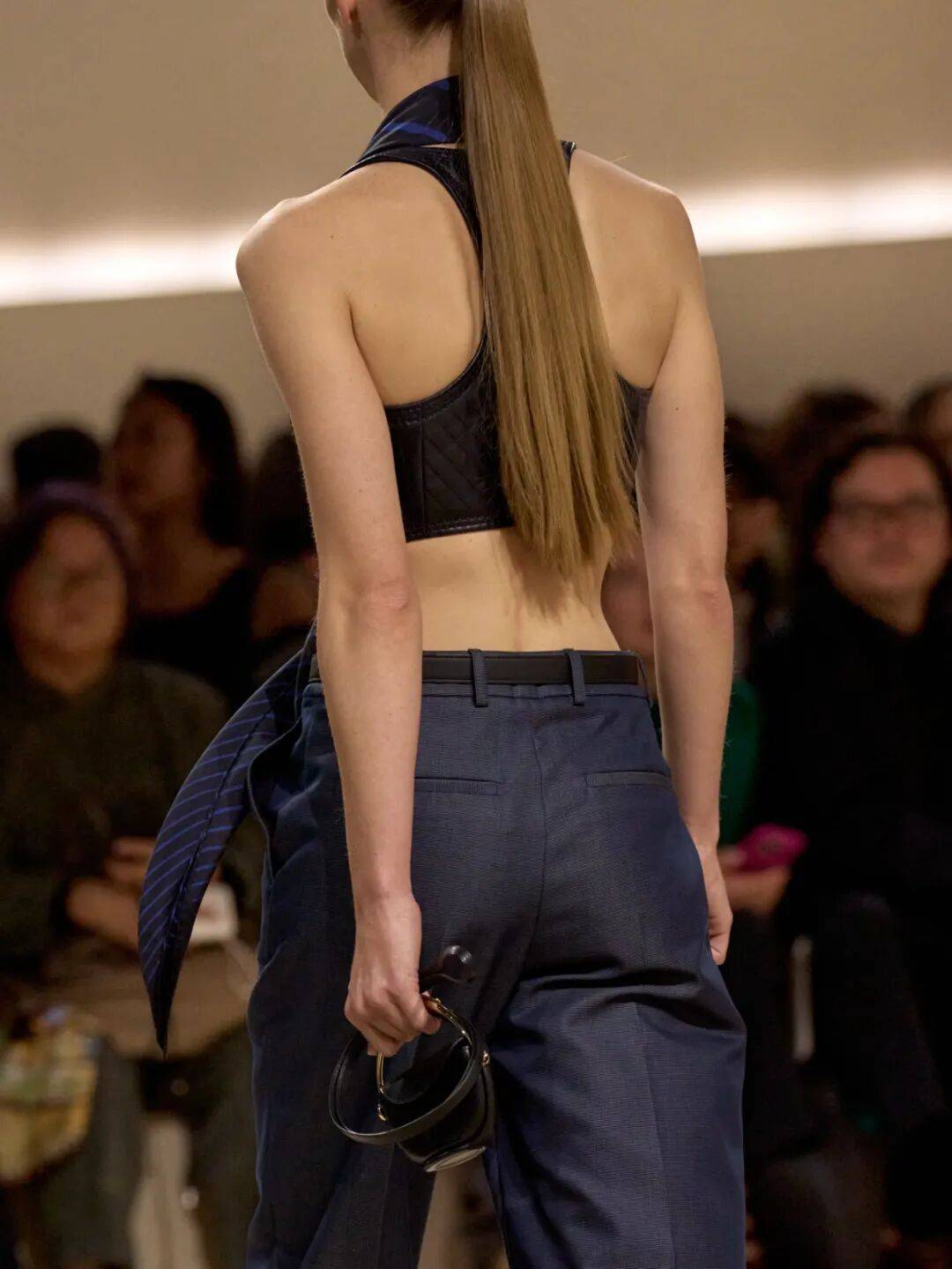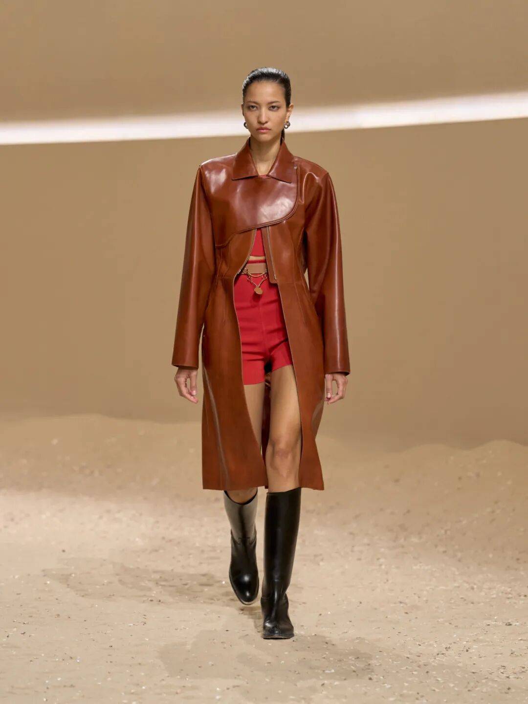 不仅如此,皮革胸衣也为整体造型增添了一份力量感,精准的剪裁像是围绕女性身体曲线绘制而成,与那些皮质拼接短裙、半身裙和长裤一同为当代女性构筑了一层软盔甲,彰显了Hermès精湛的皮革工艺,又致意女性的勇敢无畏和不羁气质。