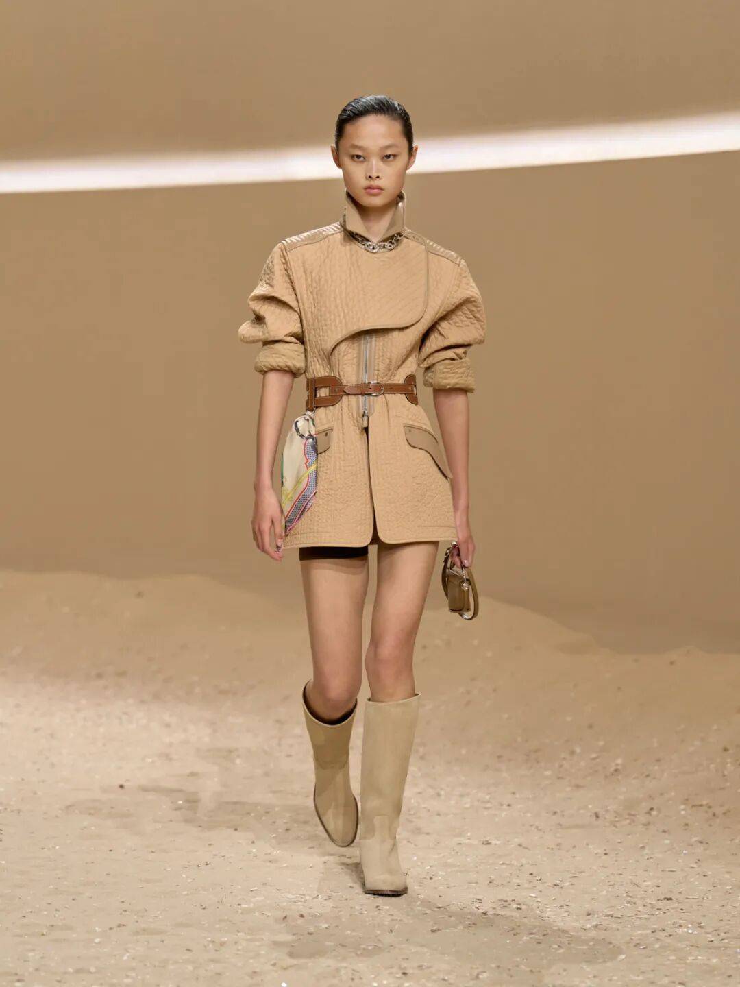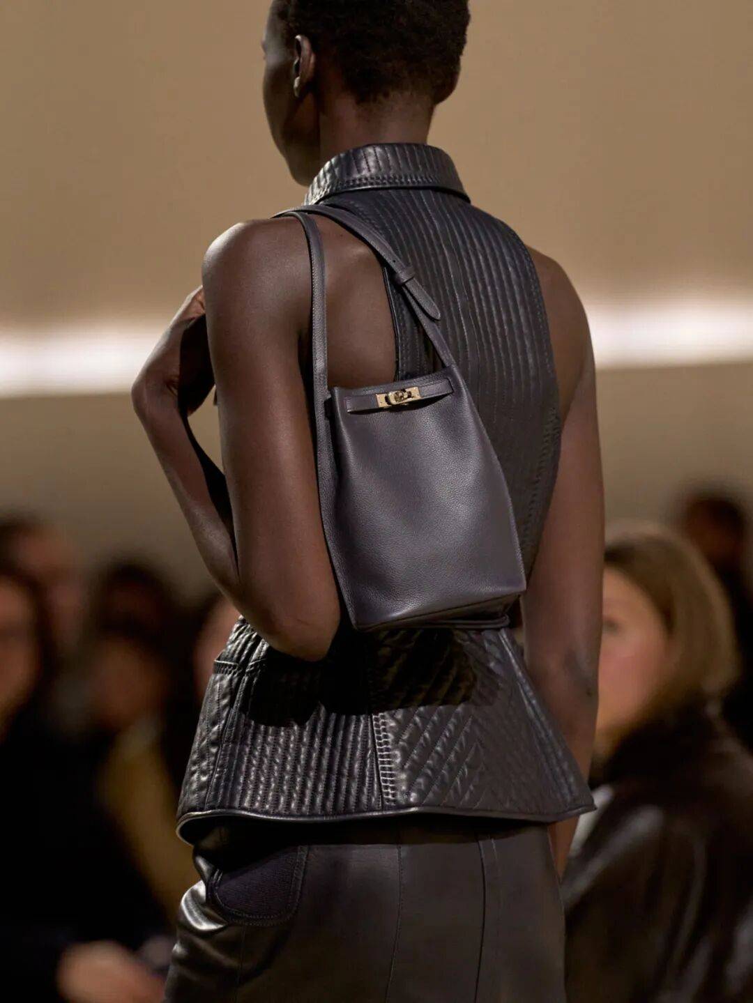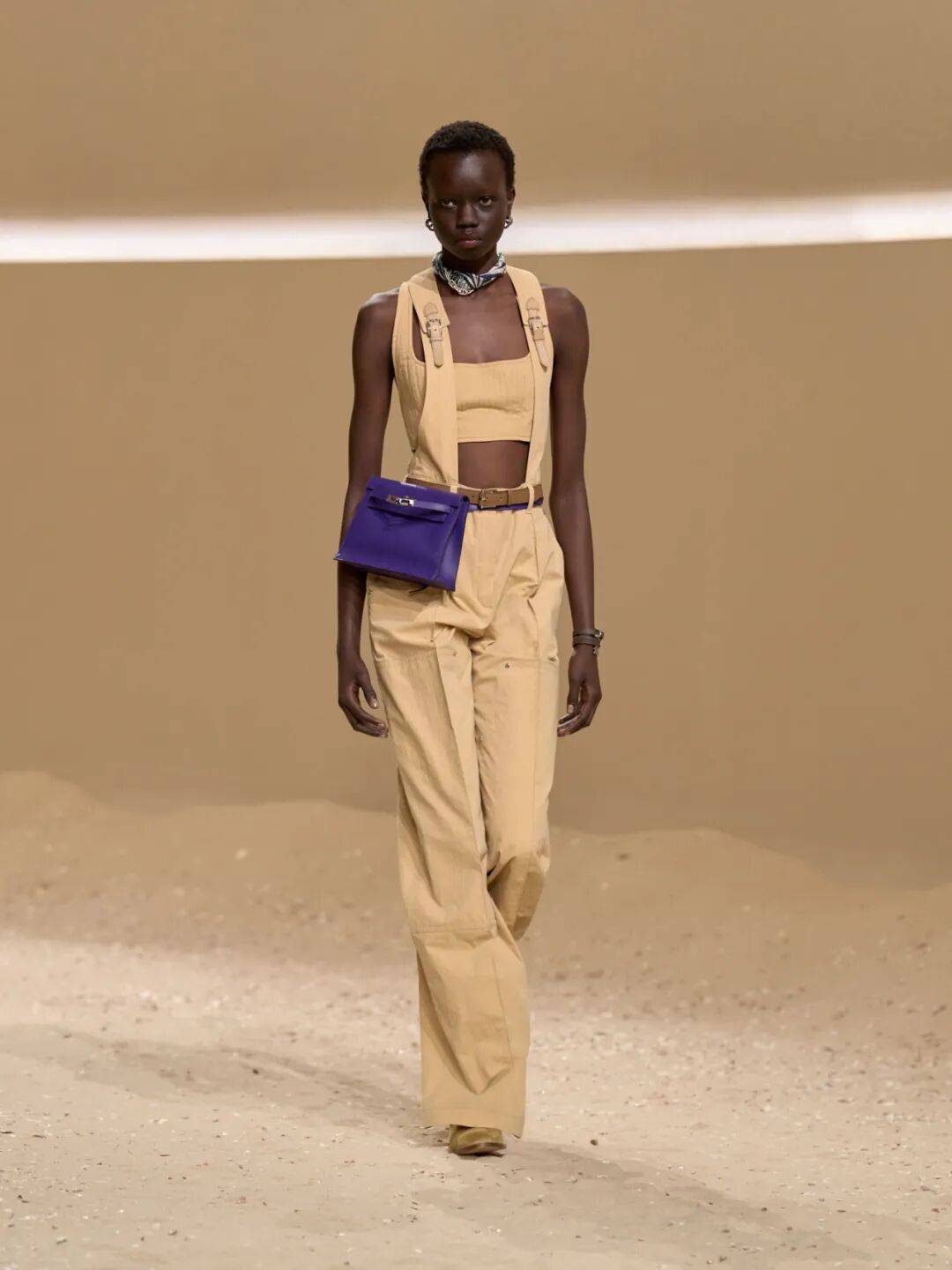 众所周知,Hermès的灵魂仍然以匠心工艺手工打造的皮革包袋为主,而著名的Birkin、Kelly等经典包袋也在本季迎来焕新。前者以优雅的棕褐色或黑色绒面皮革与经典的棕白色皮革拼接亮相,而后者则以亮眼的紫色出现在一位身着素净卡其色套装的模特腰间。