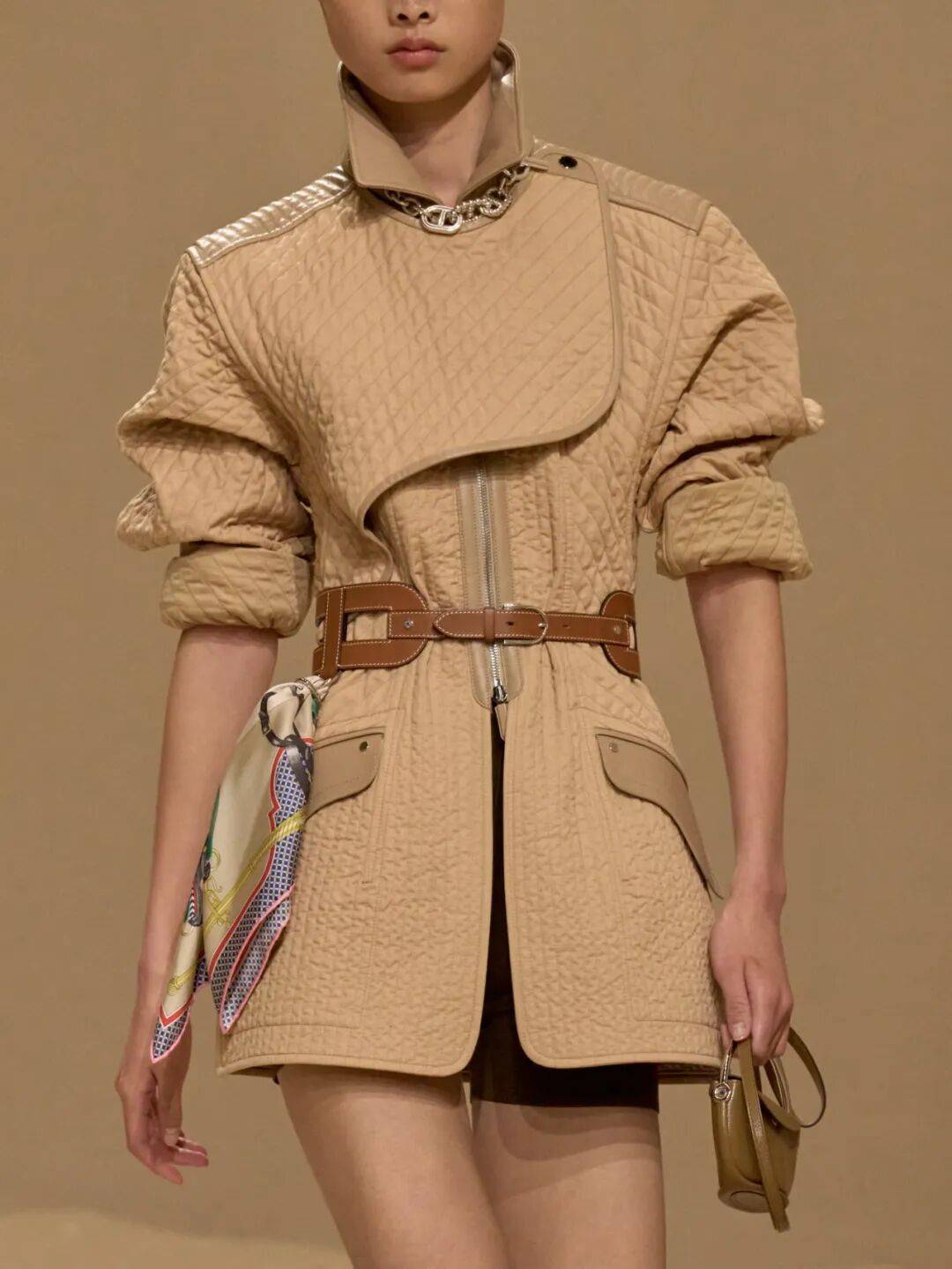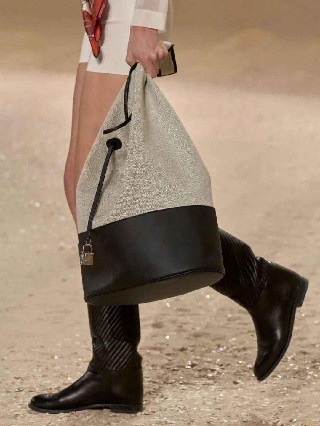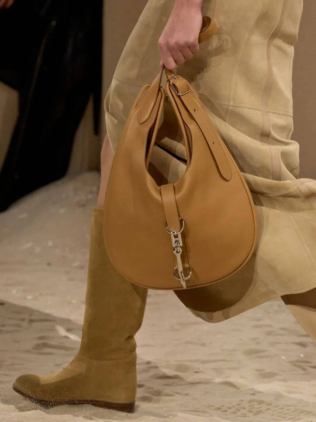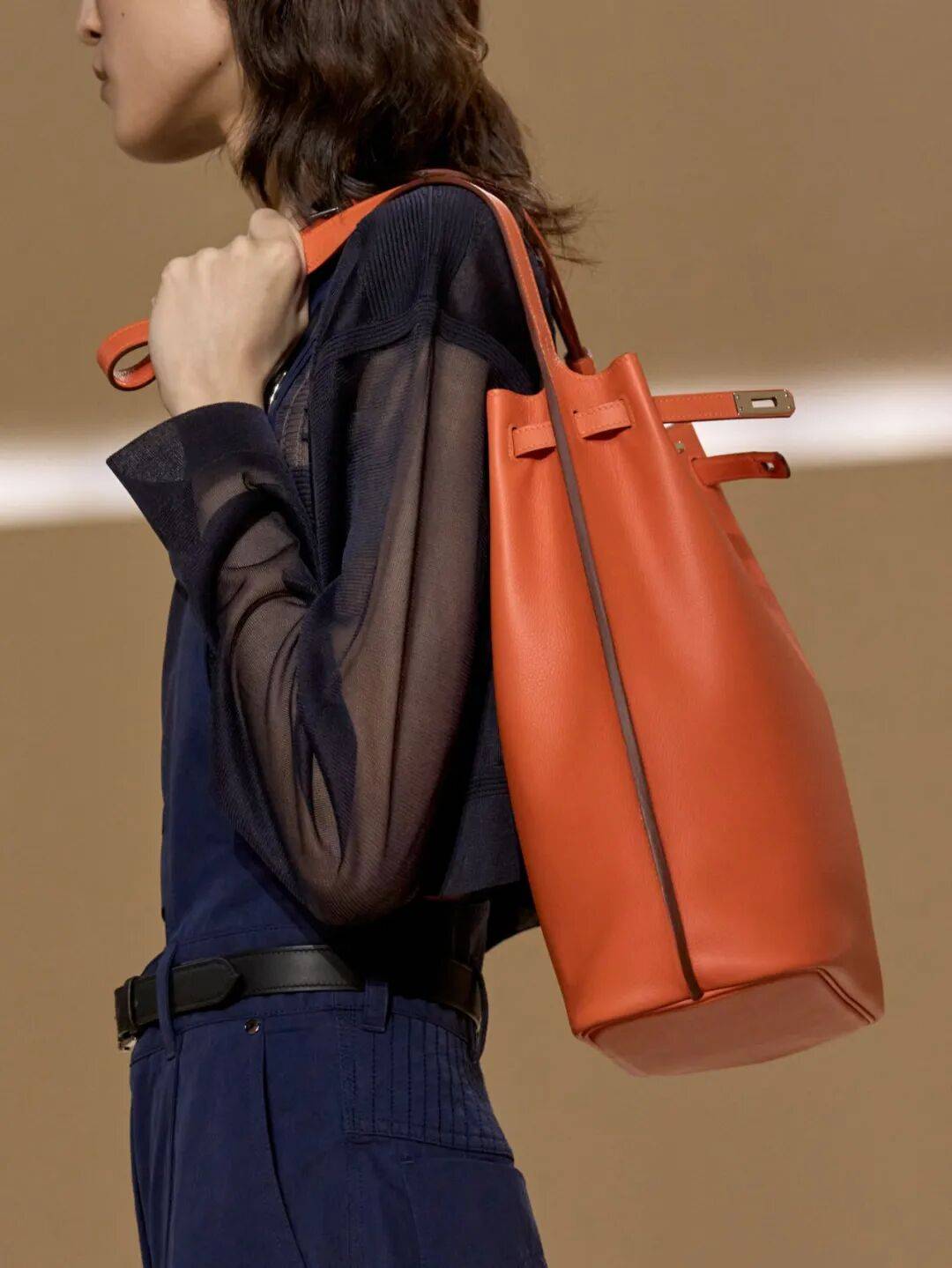 众所周知,Hermès的灵魂仍然以匠心工艺手工打造的皮革包袋为主,而著名的Birkin、Kelly等经典包袋也在本季迎来焕新。前者以优雅的棕褐色或黑色绒面皮革与经典的棕白色皮革拼接亮相,而后者则以亮眼的紫色出现在一位身着素净卡其色套装的模特腰间。