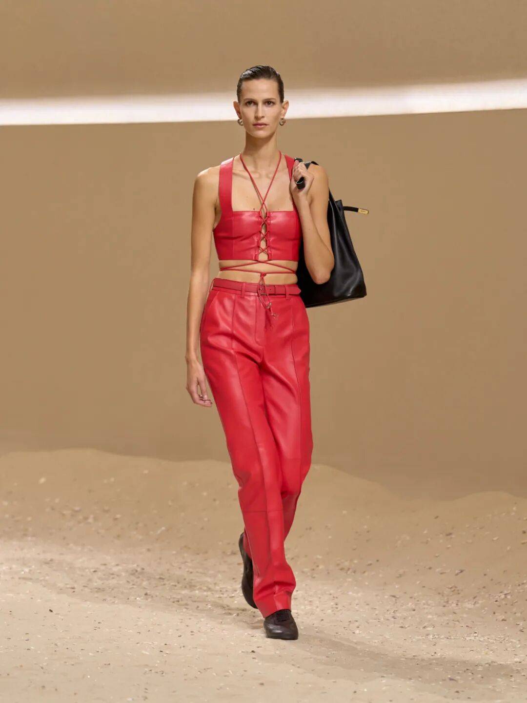 作为Hermès基因的马术运动传统,Vanhée在一众皮革造型中还加入了一些贴身剪裁的骑行裤以示强化。一些采用连体衣款式,一些则是胸衣与短裤的分割式设计,与皮革、工装短裤的差异性材质丰富视觉上的造型层次感,又出现了几套明丽红活跃了春夏季的整体氛围。