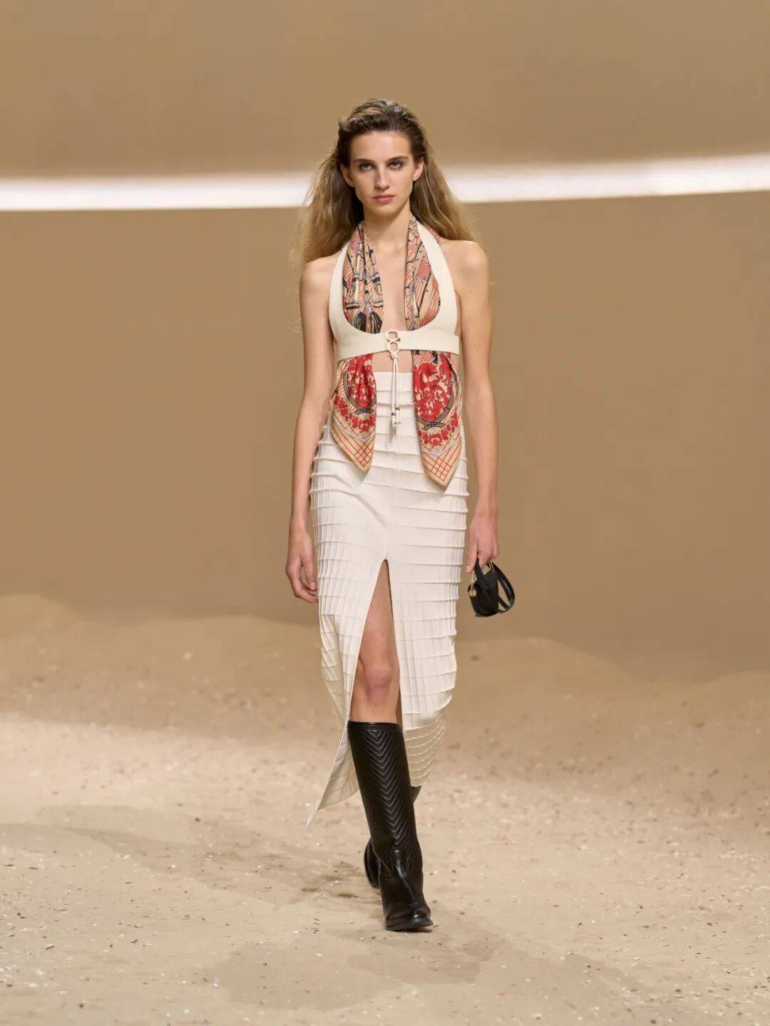 虽然Hermès以马术传统和皮革工艺著称,但自Vanhée 2014年接任女装艺术总监以来的11年时间里,她对品牌标志性的真丝方巾同样着迷。稍稍翻阅往季系列,她经常会将丝巾艺术融入女装设计,或提炼灵动图案,或径直垂于腰间,为Hermès一贯精准无比的调色盘中注入更具活力的动感。