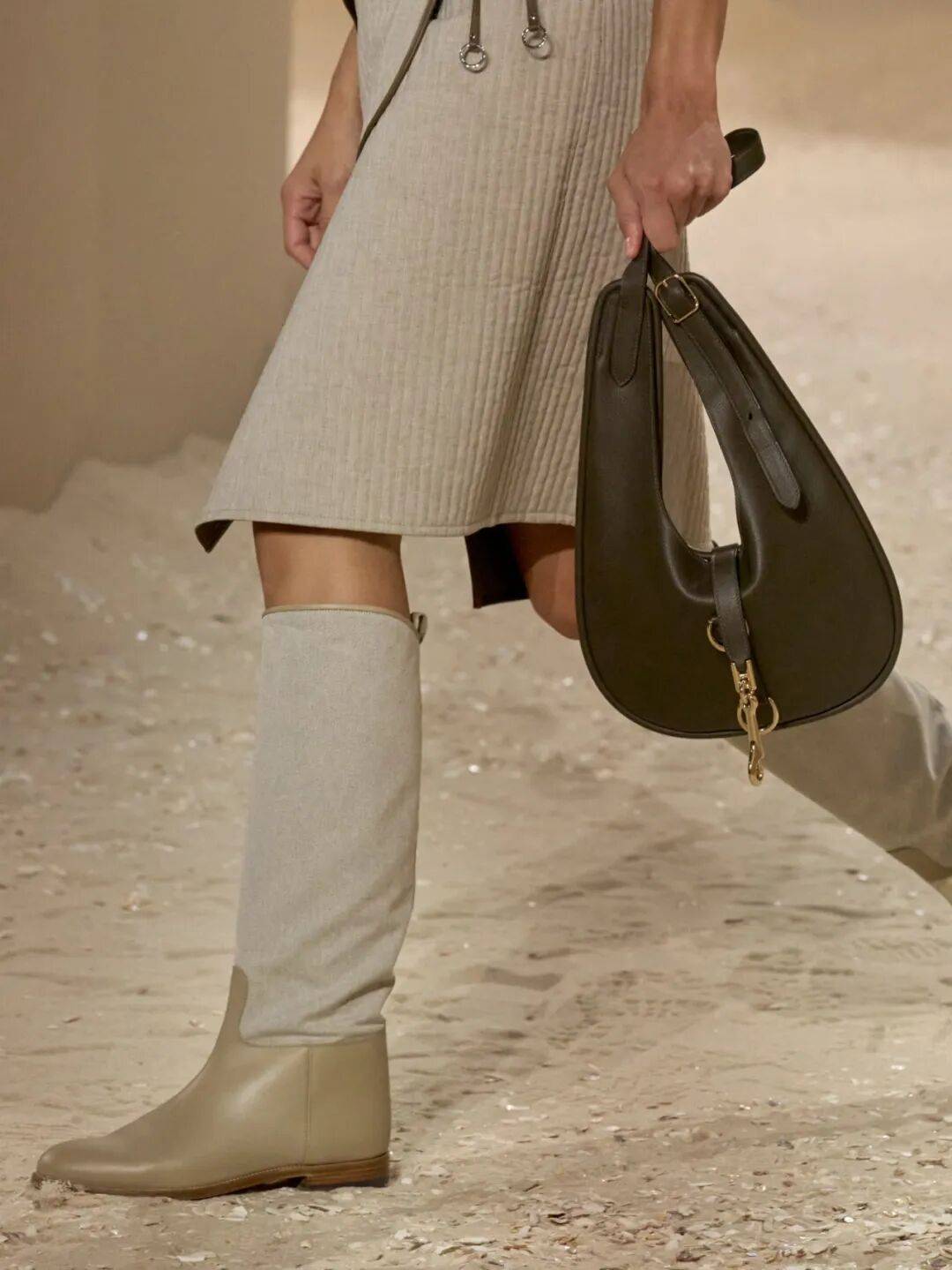 该款及膝筒靴有着不对称的鞋领设计,线条流畅,鞋头较为圆润,为了与造型适配,部分采用拼色、压纹和极密绗缝工艺处理,少量采用绒面麂皮材质,可自由搭配日常与骑装。毫无疑问,这也是她为每一位Hermès女郎打造的着装衣橱配件之一。